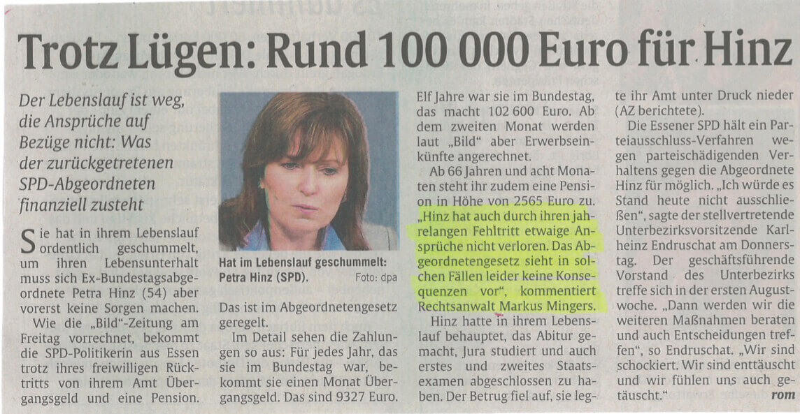 - “Trotz Lügen: Rund 100.000 Euro für Hinz”, Artikel vom 23.07.2016 (Artikel nicht online verfügbar)